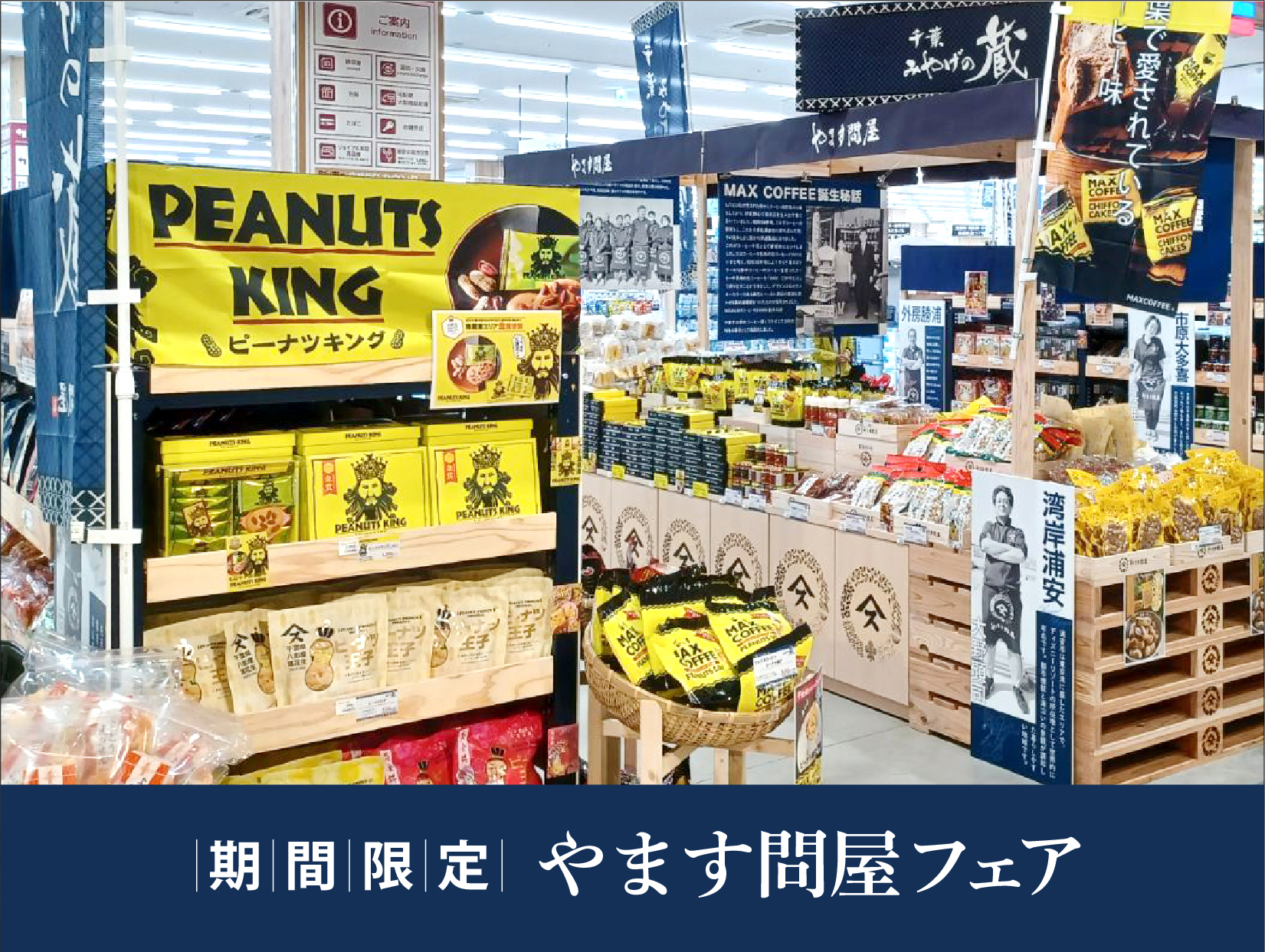 「房の駅」を運営するやます問屋のフェアを期間限定で開催!千葉県ならではの、加工食品からお菓子まで美味しい商品が大集合!ぜひこの機会にお立ち寄りください。