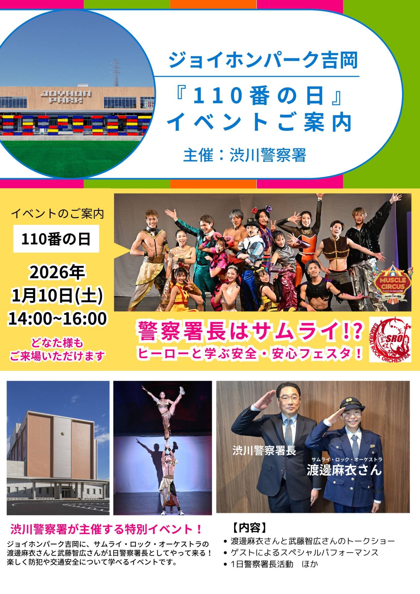 1月10日 110番の日にジョイホンパーク吉岡店に、サムライロックオーケストラの渡邊麻衣さんと武藤智広さんが1日警察署長としてやってくる!! イベント内容 ・渡邊麻衣さんと武藤智広さんのトークショーとスペシャルパフォーマンス ・パトカー、白バイの展示と試乗体験 ・実際に電話をかけての110当番通報体験
