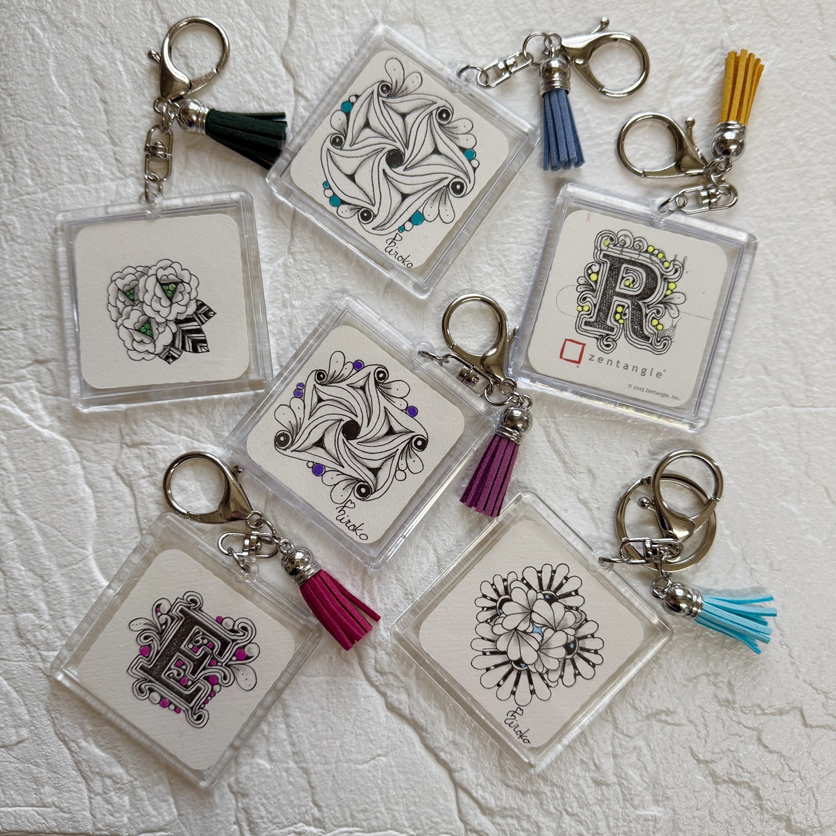 白い紙にタングルといわれる模様を黒いペンと鉛筆で描きキーホルダーを作ります。