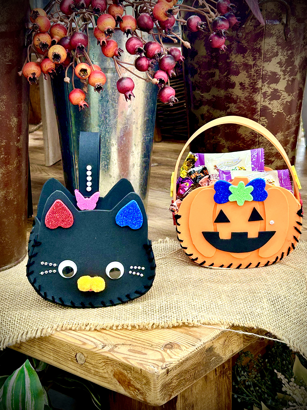 フォームシートでカボチャや猫の形のバスケットを作り、シールなどでデコレーションします。