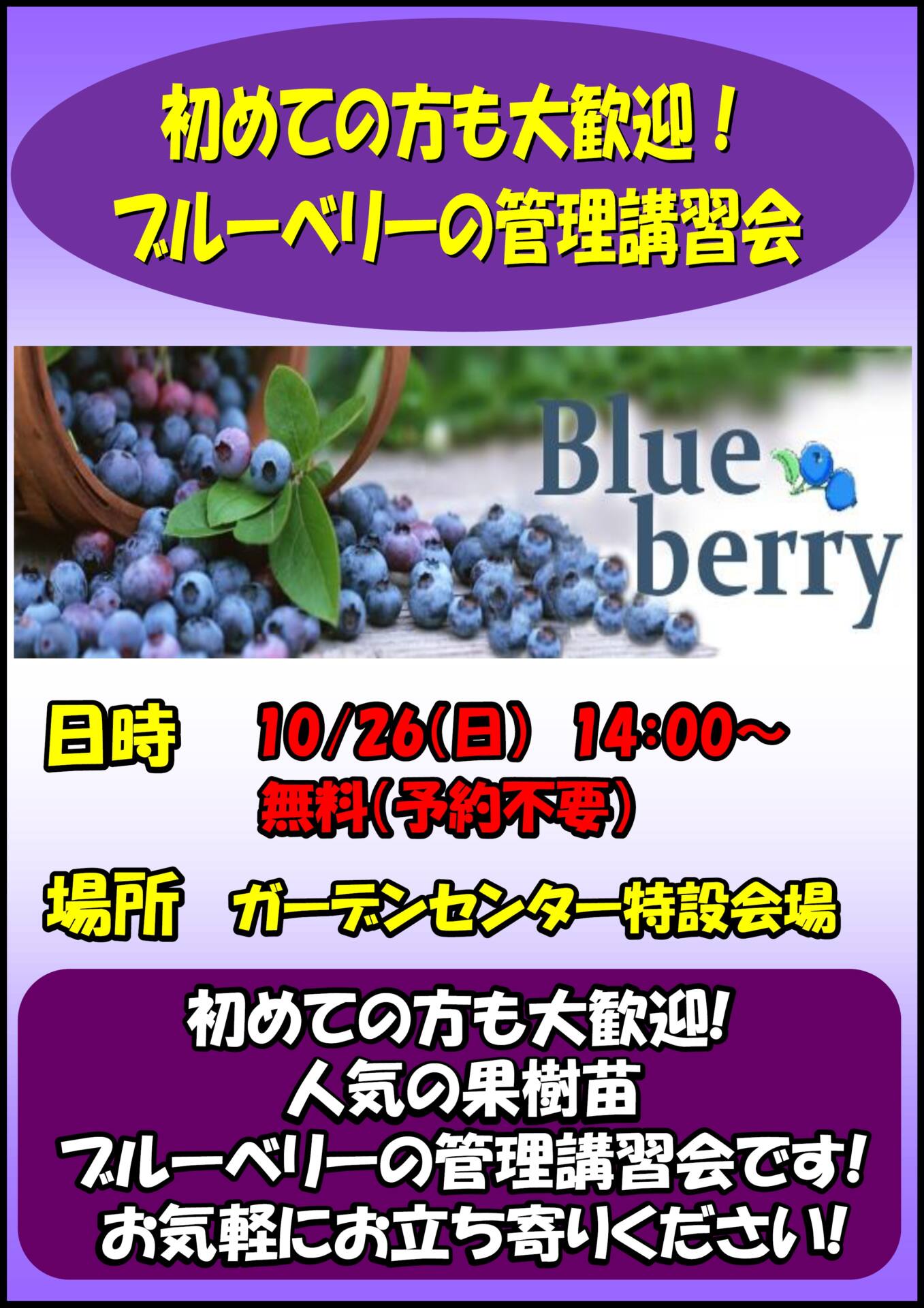 当店のスタッフによる講習会 初めての方も大歓迎!人気の果樹 ブルーベリーの管理方法を説明します。