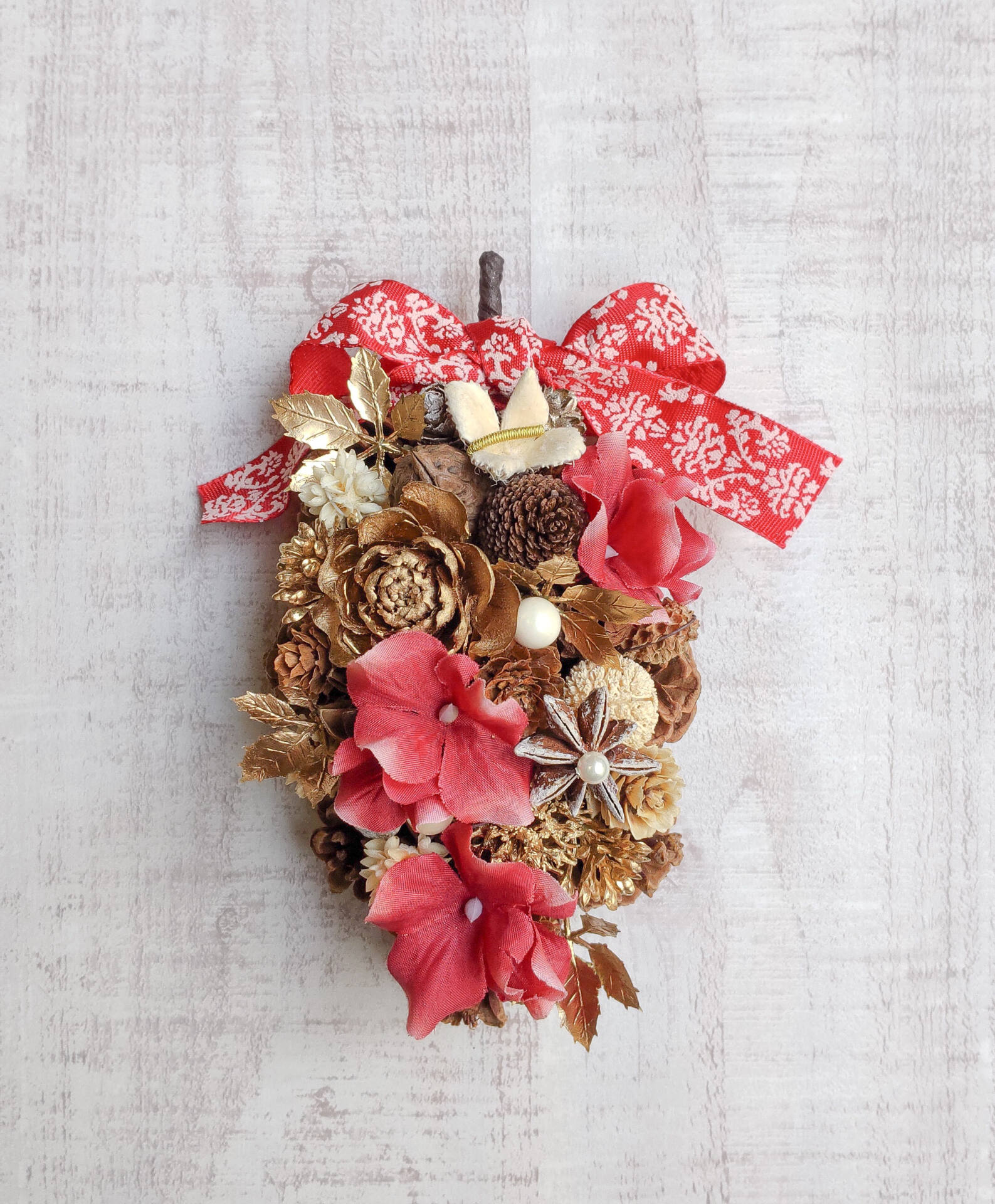 木の実やスアーティフィシャルフラワーを使いクリスマスオーナメントを作ります。