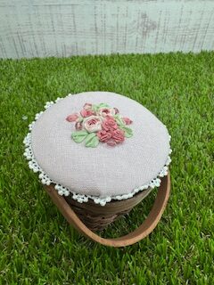 小さなカゴの小物入れにリボン刺繍を入れます。