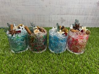 ハードタイプのジェルキャンドルをハサミでカットして作ります。飾りのドライフラワーや木の実等は火を灯す際は取り除いてください。※材料無くなり次第、終了になります。