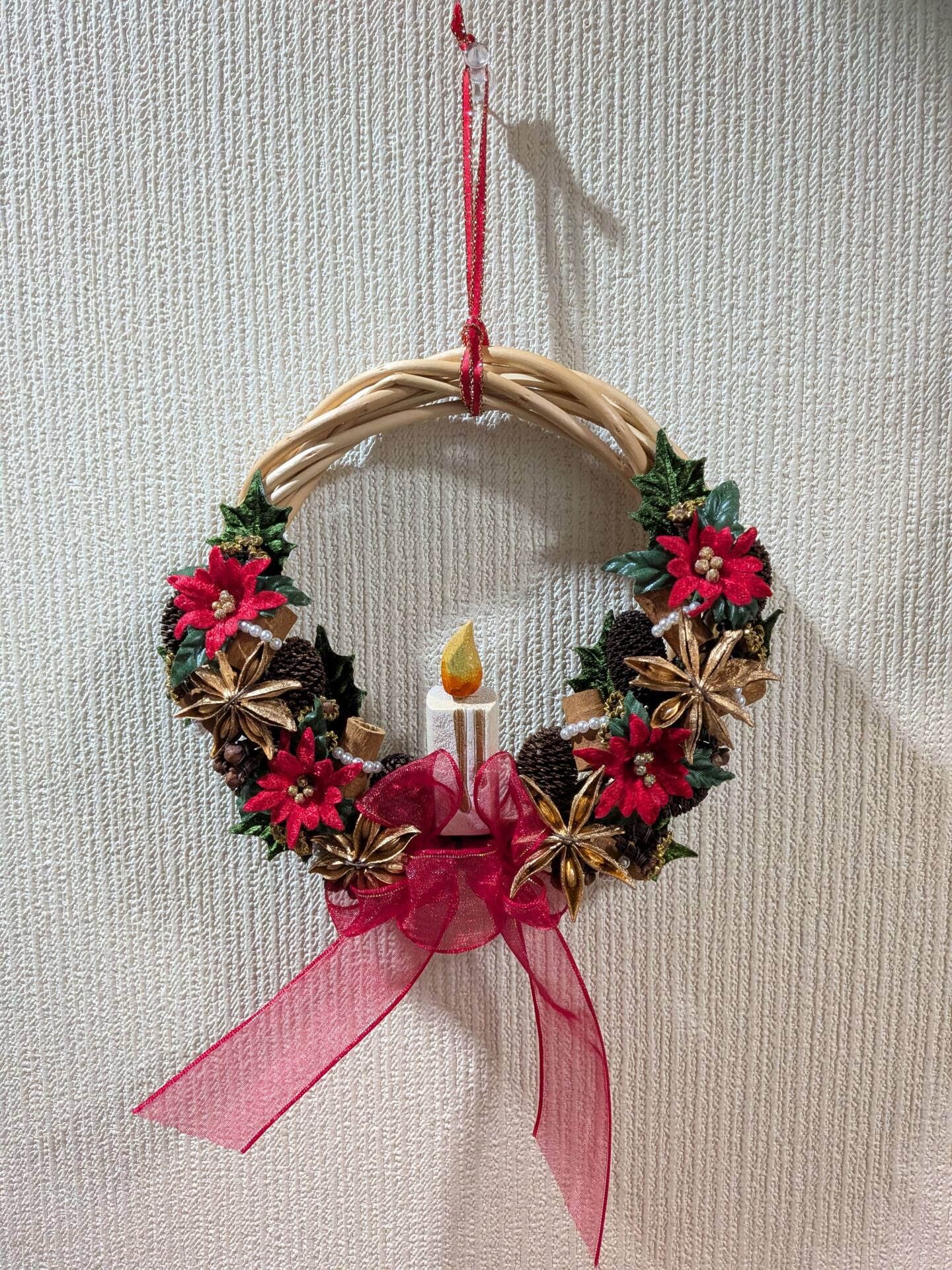 オーストリアから取り寄せた造花のポインセチアと、スパイスと木の実を糸巻きワイヤーで、組んでいきます。真ん中に赤いリボンと木製のキャンドルを取り付けて出来上がり!スパイスの香りをも楽しめる可愛らしいリースです。