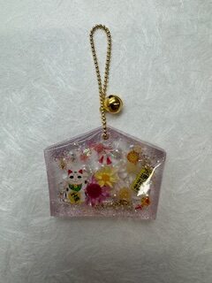 和柄の縁起の良いシール、ドライフラワーやパールを使ってオリジナルのお守りを作ります。