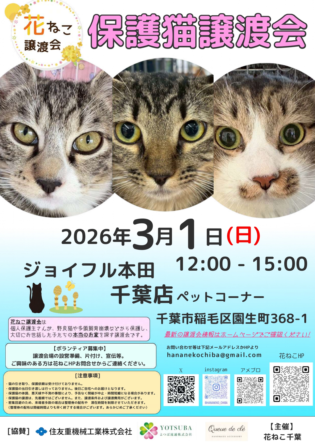 3月1日、12:00~15:00に、千葉店の2階ペットワールドにて、保護猫の譲渡会が開催されます。