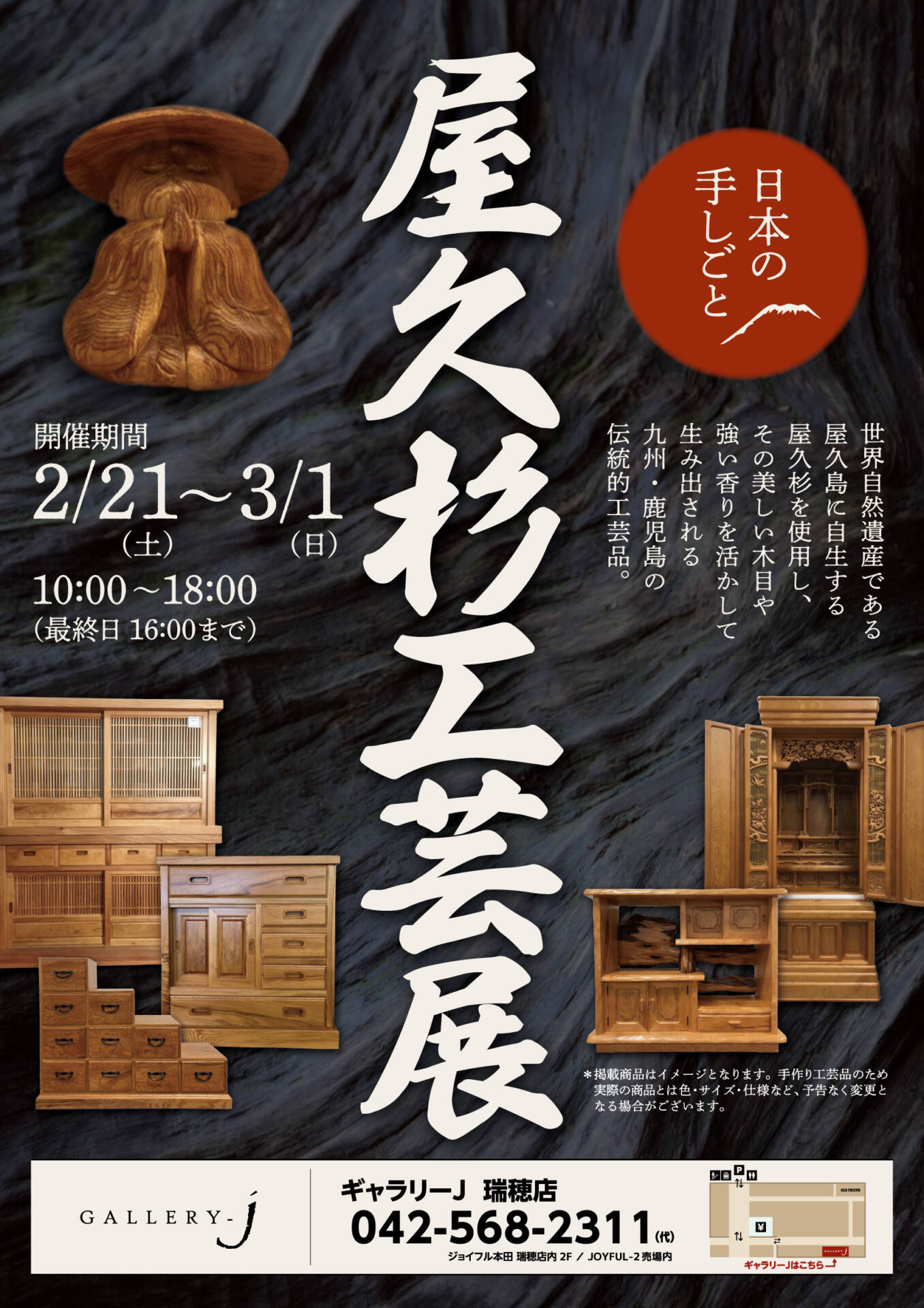 貴重な屋久杉で作られた家具や仏壇、装飾品などを多数展示販売いたします。