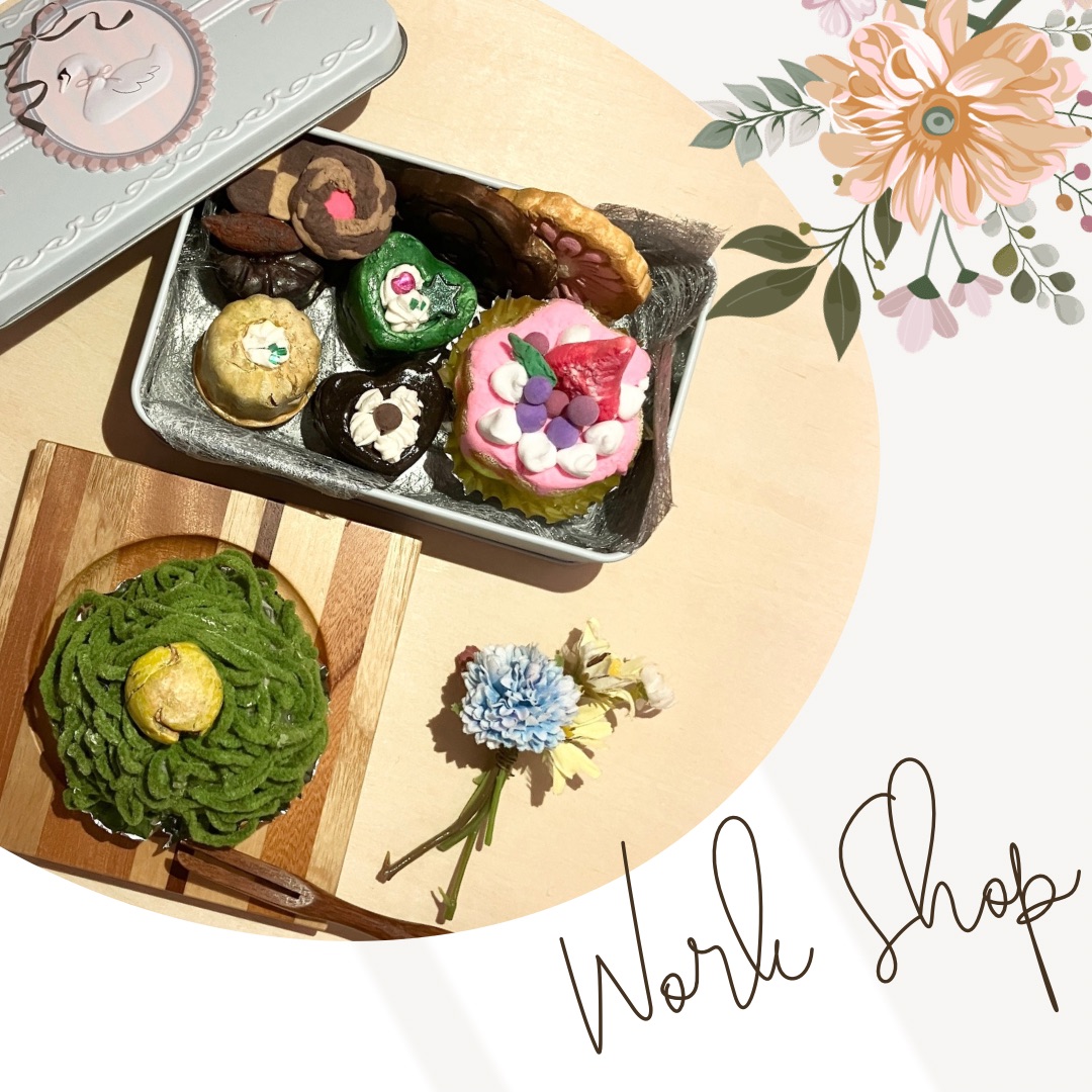 作る事を楽しみながら、色彩や造形への興味を導くゆきひろこ先生によるアートワークショップです。ご用意の中から粘土やパーツを組み合わせてスイーツを3種類作る事が出来ます。