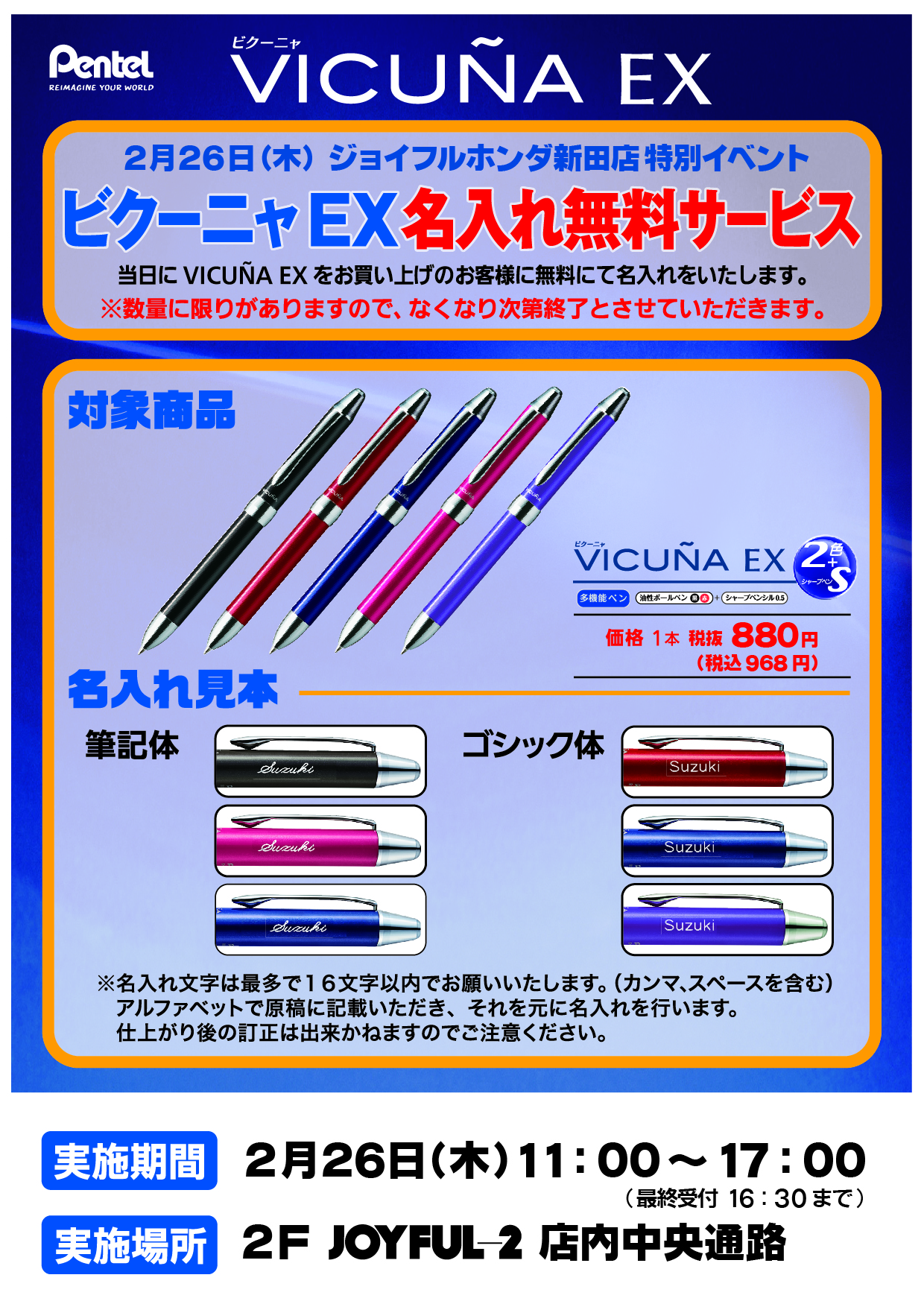 卒業・入学・就職祝いにおすすめなぺんてるのビクーニャEXを1日限定で無料で名入れいたします。大切な方への贈り物やご自分用にいかがでしょうか。事前予約も承ります。